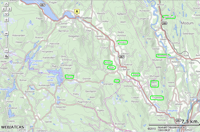 With "A" marking the same spot, and zooming out considerably, the following view shows a significant number of locations relevant to research contained within this website. Each of these significant areas is marked by green highlight colour.